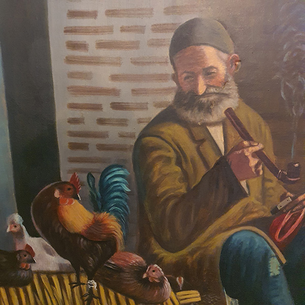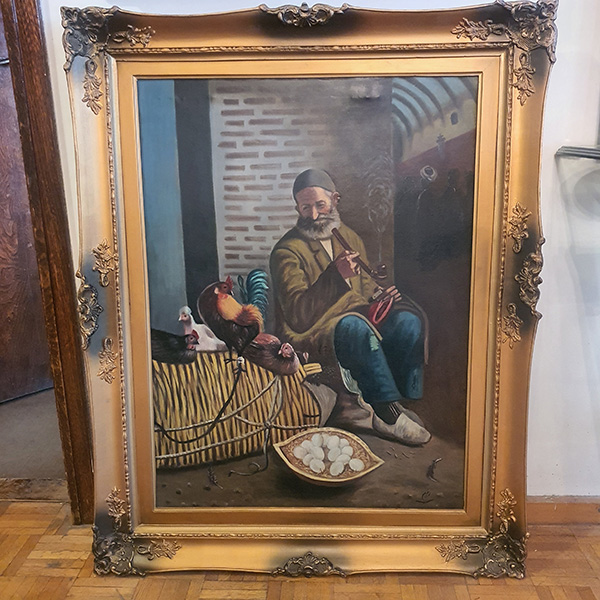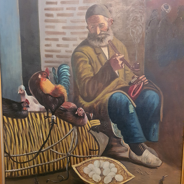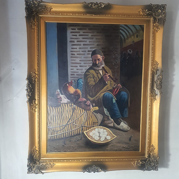 تابلوی پیرمرد روستایی خسته همراه با مرغ و تخم مرغ