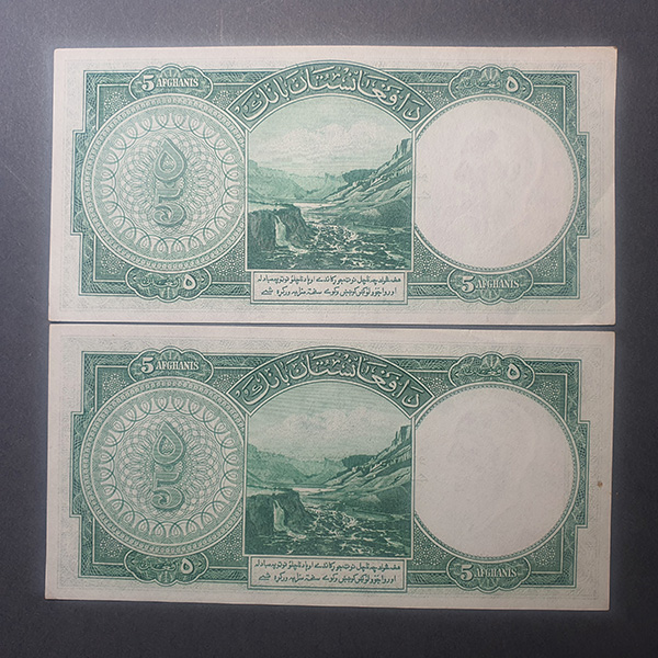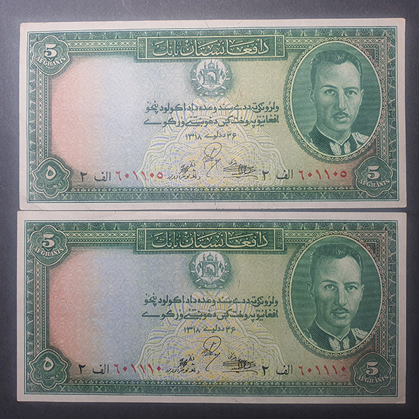 دو عدد اسکناس 5 افغانی متعلق به زمان 1318 ظاهر شاه با شماره جذاب
