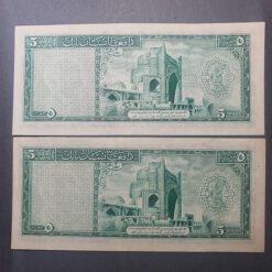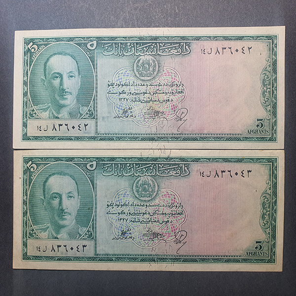دو عدد اسکناس 5 افغانی متعلق به زمان 1327 ظاهر شاه با شماره سریال