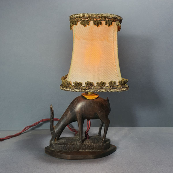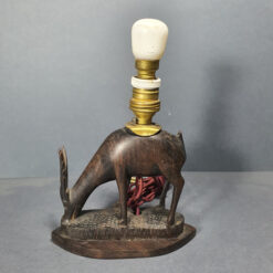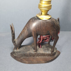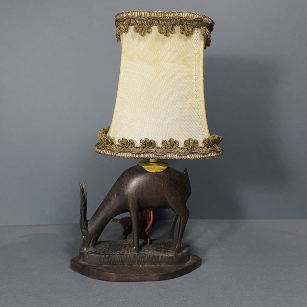 یک عدد آباژور با کلاهک یا شید نصب شده روی مجسمه زیبای گوزن ساخته شده از چوب آبنوس دست ساز قدیمی عینا مطابق تصاویر